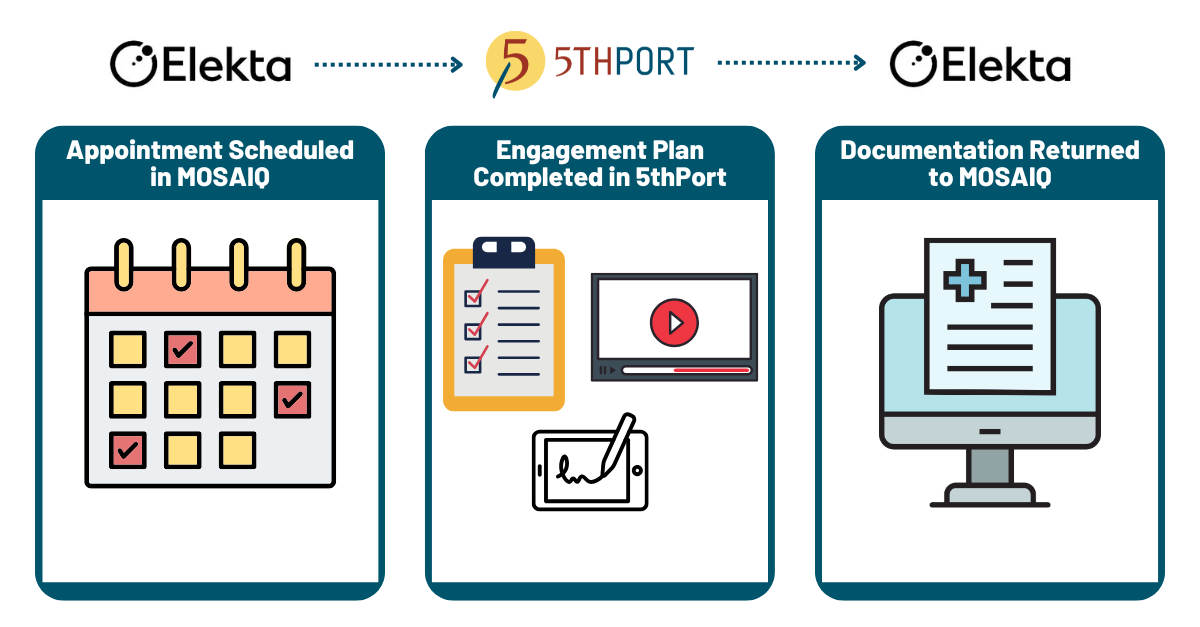 With a 5thPort–MOSAIQ integration, appointments are scheduled in MOSAIQ and transferred into 5thPort. From there, patients complete their engagement plan at home, on their own time and device. These engagements may include a mix of digital education, videos, forms, and electronic consents – all delivered through the 5thPort platform.